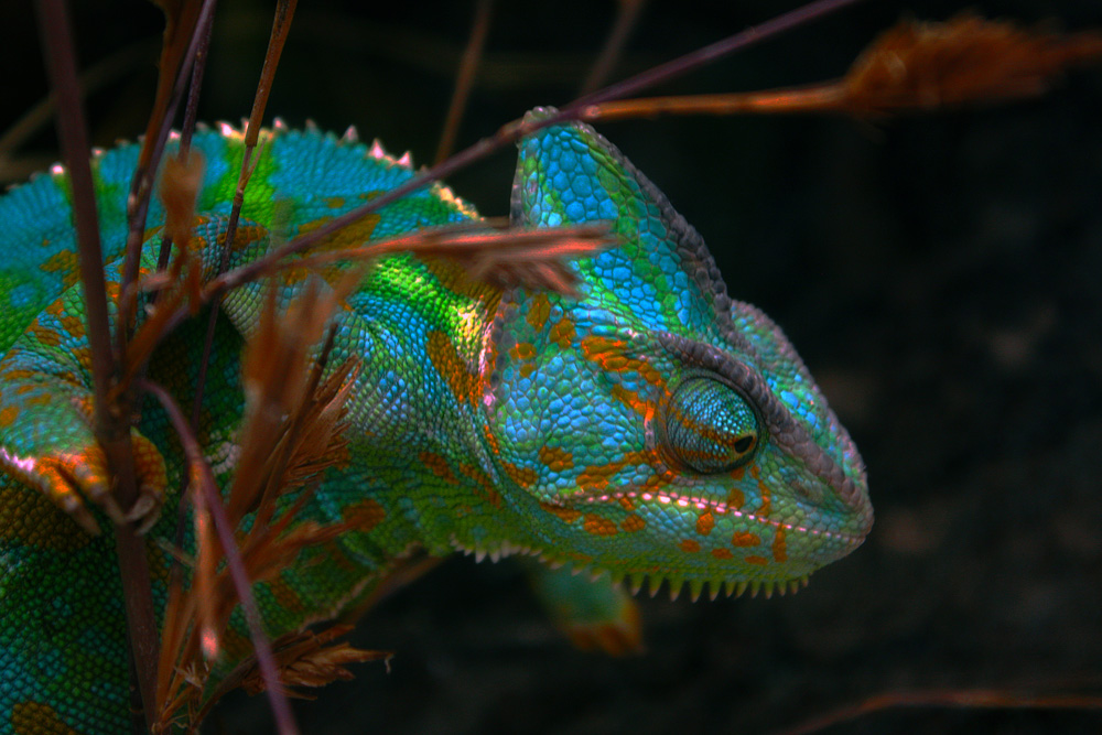 Von den drei aktuellen ist nur das Chamäleon aus dem Tierpark. Es rauscht etwas und so richtig glücklich bin ich nicht - das gemeine Teil hat sich bewegt und ich war gut damit beschäftigt, die Spiegelung der verglasten Behausung rauszufiltern. Da bleiben kaum Ressourcen für den sonstigen Feinschliff.