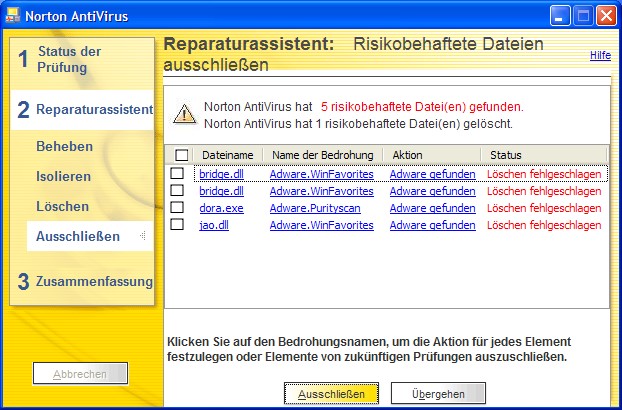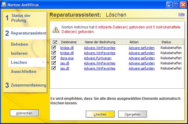 Dank Ad-Are 6 konnte 6 Files gelöscht werden, jetzt lasse ich zur Sicherheit nochmals Norton AntiVirus drüber fegen...