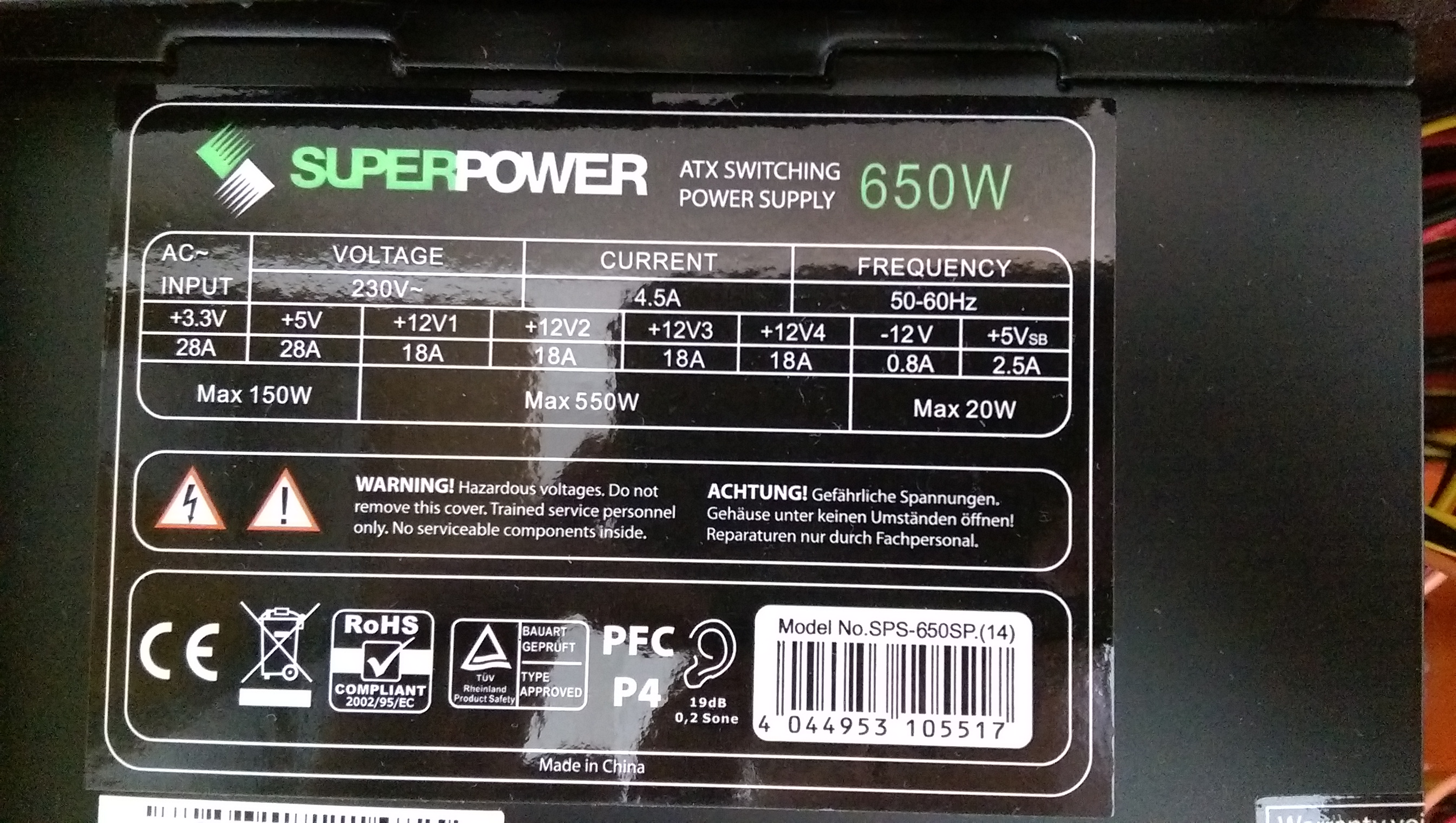 Ahja... Rein faktisch klingen 4x 18A (12V1 bis 4) nicht schlecht. Dennoch lassen mich einige Punkte aufhorchen: der Hersteller ist mir gänzlich unbekannt, Infos zum Gerät sind rar. Auf dieser Händlerseite steht jedoch, dass das NT eine nur passive PFC und nur einen PCIe-Grafikkarten Anschluss hat. Ein anständiges 650W NT hat mindestens 2 und eine passive PFC ist idR ein recht sicherer Indikator für ein insgesamt minderwertiges Gerät.