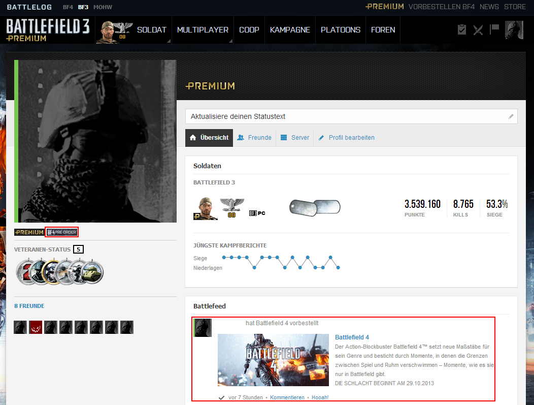 Bei mir wurde es direkt im Battlelog angezeigt (siehe Pic). Bei meiner letzte Bestellung bei Origin hat es ganze fünf bzw. sechs Tage gedauert, bis die Kreditkarte belastet wurde und bei eben dieser Bestellung hat es auch mehrere Tage gedauert bis etwas im Bestellverlauf zu sehen war.