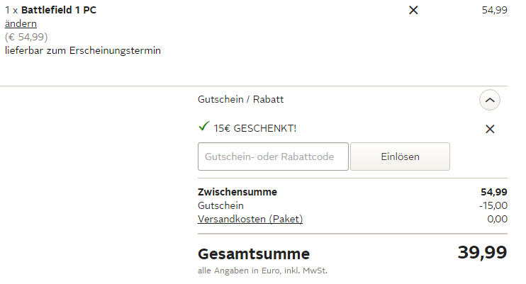 Dedder schrieb:Aus 20Euro Rabatt sind jetzt aber 15Euro geworden und 5% Kennenlern-Rabatt gibt es auch nicht mehr --> BF1 gibts über Otto.de jetzt nur noch für 39,99Euro.