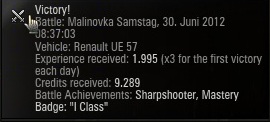 Na bravo! Fehlen Dir ja nur noch 456 Punkte um zu mir aufzuschließen. Die 1702 XP, die bei meinem M4 Sherman als Highscore in der Statistik stehen, sind bei einem Unentschieden rausgekommen
