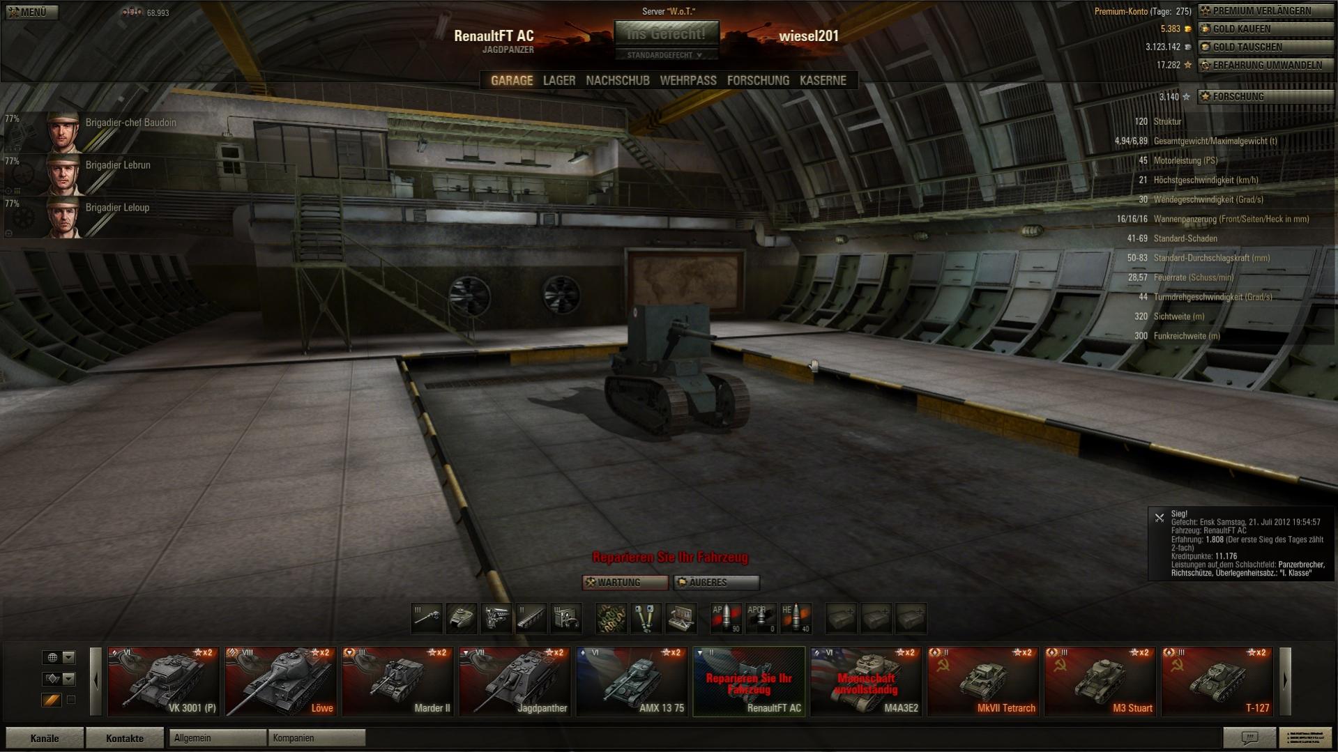 Ich glaub ich hab einen neuen Fun-AT für mich gefunden: Den kleinen RenaultFT AC. Nach 5 Spielen komplett erforscht und dabei noch 1390XP überbehalten. Ich denke ich werde den Kleinen noch eine Weile behalten, mit der großen Wumme macht er echt Laune...