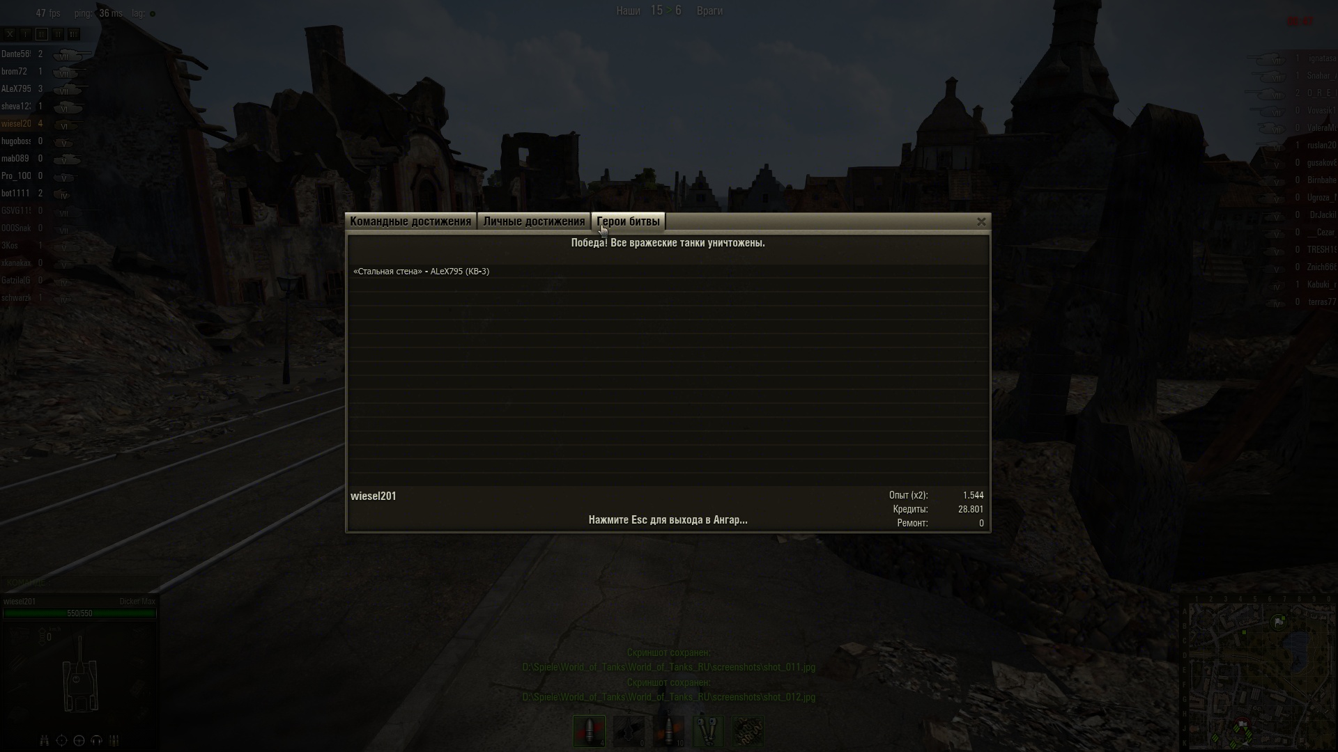 Zu deutsch: 1544 XP (2x für das erste Gefecht des Tages), erhaltene credits 28.801, Überlegenheitsabzeichen 2. Klasse. Ach ja, anschließend habe ich für das Aufmunitionieren 9.600 credits bezahlt. Reparaturkosten fielen nicht an. Reingewinn: 19.201 credits. Nicht zu verachten, zumal das Überlegenheitsabzeichen 2. Klasse dabei raussprang (die statistische Bedeutung muss ich dabei wohl nicht noch extra erläutern). Also: Gewinn sollte drin sein, aber wenn man über 20.000 Gewinn in einer Runde kommt, dann ist die Runde schon sehr gut gelaufen!Бой: Уайдпарк Donnerstag, 13. September 2012 00:11:57