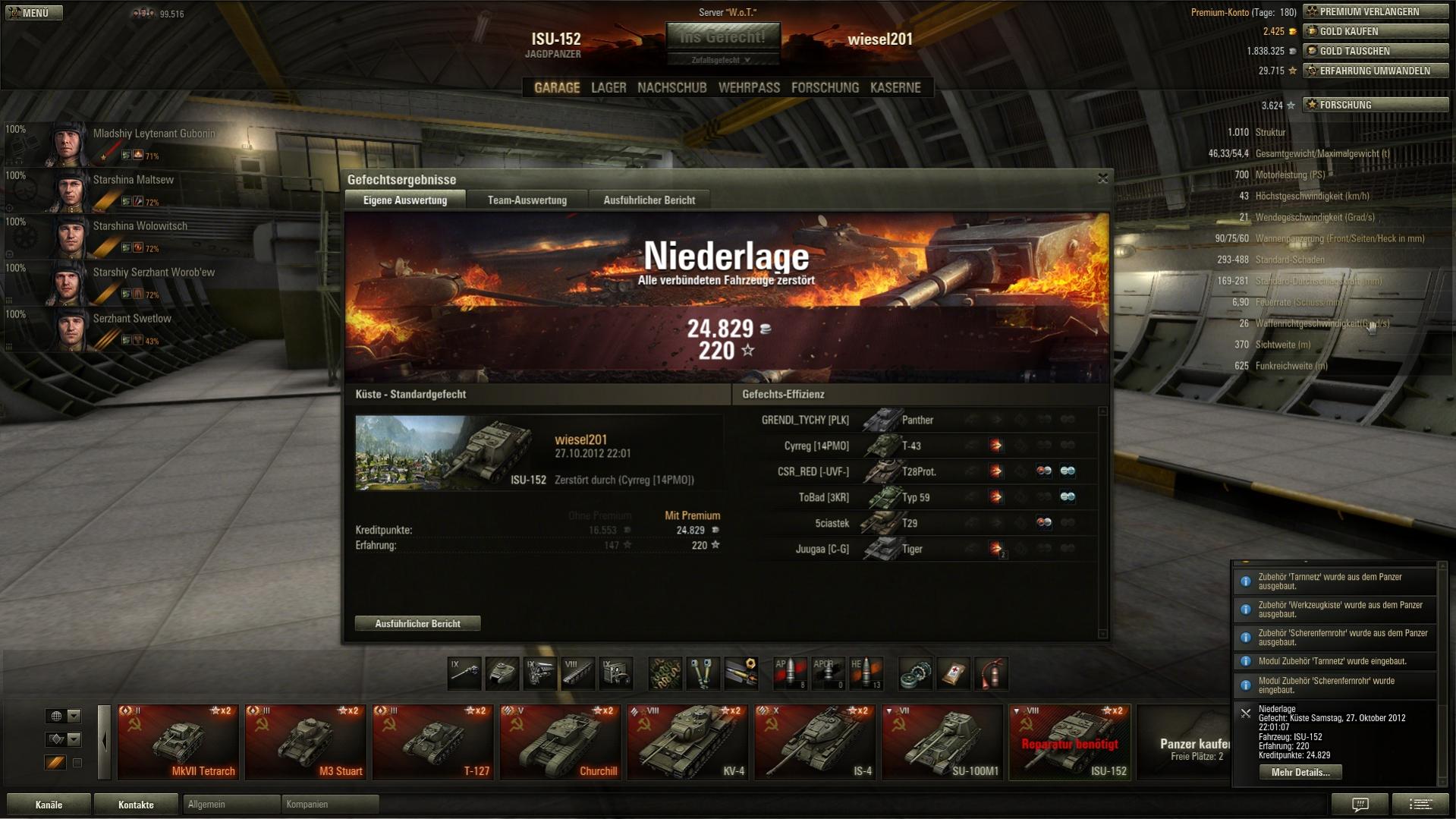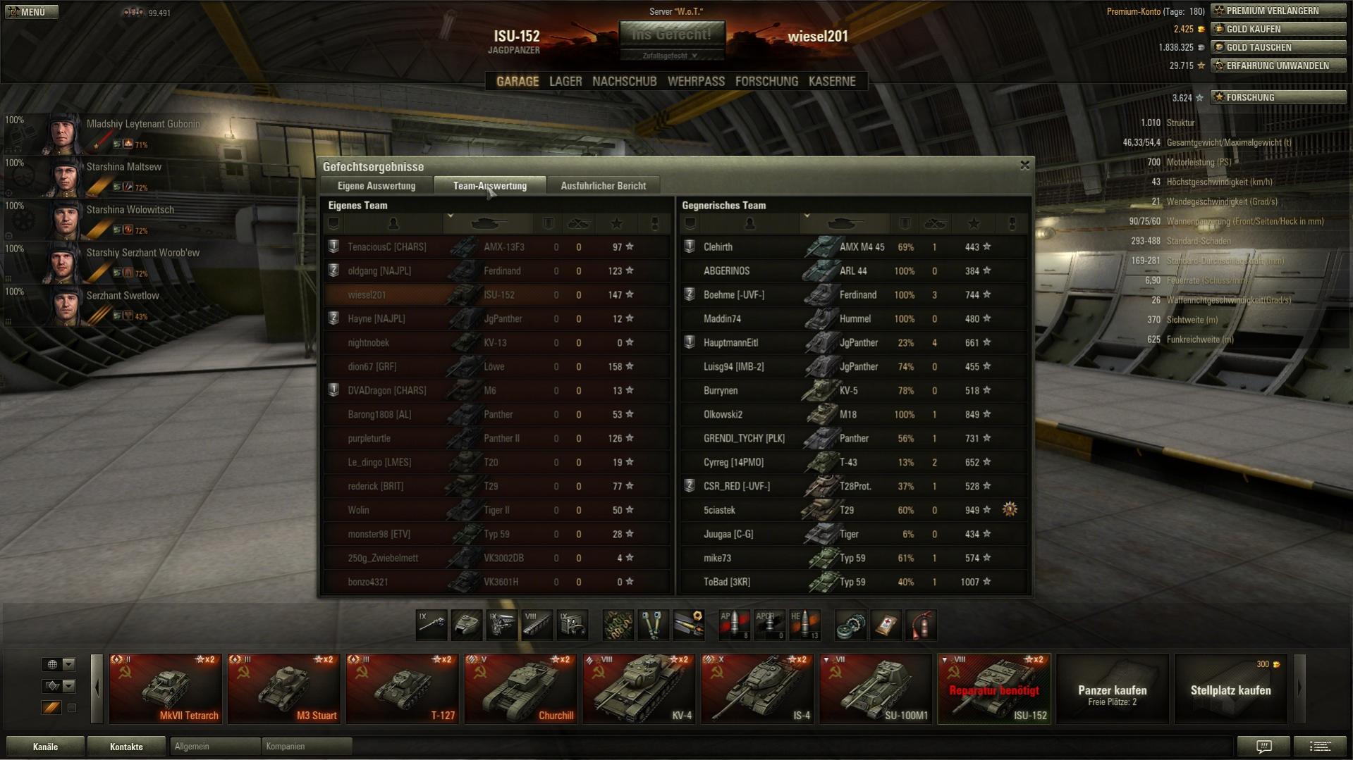OMG, sowas hab ich noch nie erlebt: 0:15 verloren. Ich hab zwar 4 Gegner beschädigt, aber keinen vernichten können. Nur dank Premium-Account blieb ich wenigstens im Plus bei der Runde. Ich konnte gar nicht so schnell gucken, wie ich plötzlich aus verschiedenen Richtungen zusammengeschossen wurde...