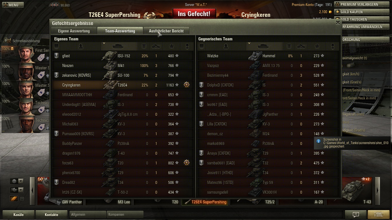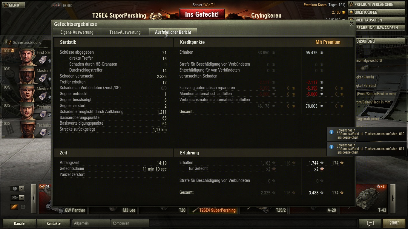 PS: Für alle die überlegen 15 % Rabatt auf einen T8 Premium zu nutzen, ich kann als günstigstes Angebot den SuperPershing für 6120 Gold empfehlen. Meine Creditausbeute sind im Schnitt ~50-60 k pro Spiel abzgl. der Kosten. Der MM ist human zu ihm, und ich habe bisher keinen Gegner gehabt - welcher nicht penetrierbar war. Das liegt unter anderem auch daran, das seine Front ein Wunder der Abpraller und 0% Schäden ist, so das man in Ruhe anvisieren kann. 100 % Crew auf BiA, Lüftung, Ansetzer und Richtantireb einbauen sowie statt Feuerlöscher lieber 100 Oktan Benzin nehmen - schon habt Ihr den perfekten Creditfarmer.