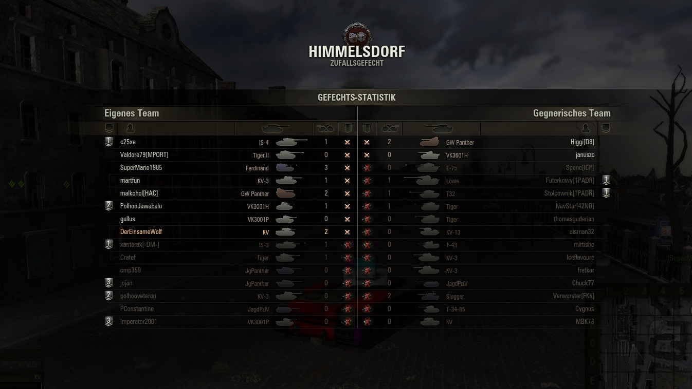 Schlimmstes Erlebnis war bisher der pre Patch Panther I, fuhr gerade auf Campinovka den Berg hoch als von oben ein Leopard angeschossen kam. Ich traf mit dem ersten Schuss und der prallte leider ab. Danach knallte der mir den Hintern mit Geschossen voll - nach dem ersten brannte ich, was mein Ammorack + Turm beschädigte - einen weiteren Schuss konnte ich noch an ihm anbringen - den er wiederrum zum bouncen brachte. Starb elendig den Feuertod