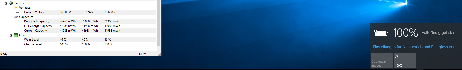 Ich hab neulich auf dem HWMonitor gesehen, dass sich der Akku nur bis 41988 mWh (In Windows 100%) von maximal 76960 mWh auflädt und dass dieser Wert wohl auch der maximale Ladestand ist. Andere Tools zeigen dieses Verhalten ebenfalls auf. Gibt es eine Möglichkeit, die restlichen 35000 mWh freizuschalten um den Akku komplett zu laden (z.B. für längere Laufzeiten für unterwegs) ?