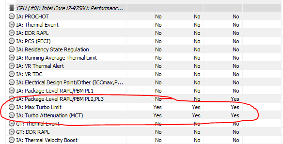 HWiNFO64 zeigt mir maximal 4,2GHz ein, aber meistens max 4,1GHz. Es findet ansonsten auch kein erkennbares throttling statt. Etwas seltsam ist evtl. das bei "IA: Max Turbo Limit" auf "yes" steht?!