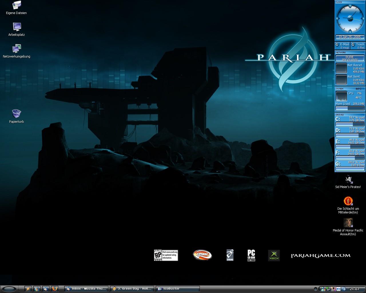 Ein recht langweiler Desktop, aufgeräumt, kein Müll im linken Teil der Taskleiste, alles schön sortiert. Und vor allem kein buntes XP Zeug! Bloss nicht denken das ich ordentlich bin, aber ich hasse zugemüllte Desktops/Rechner .