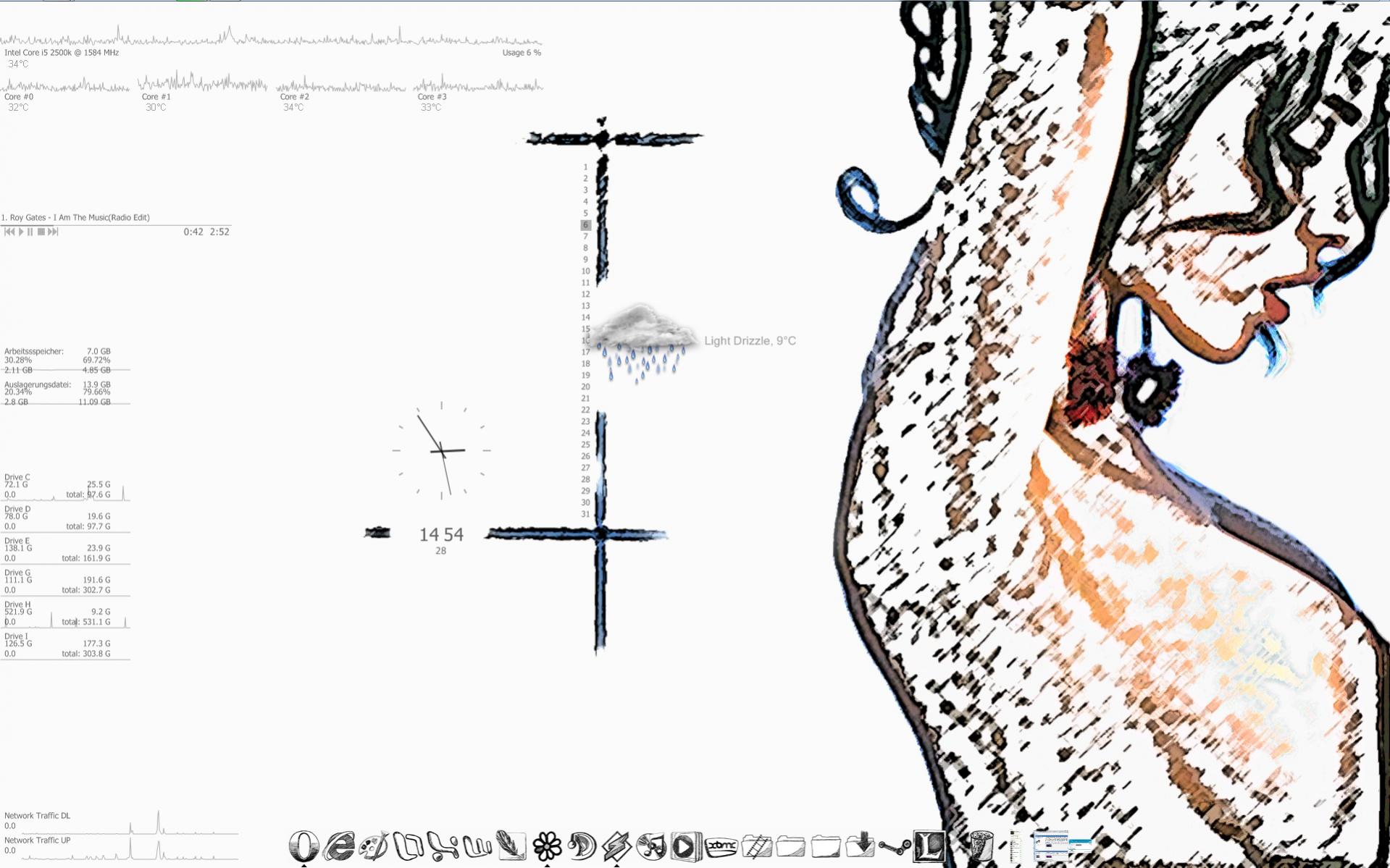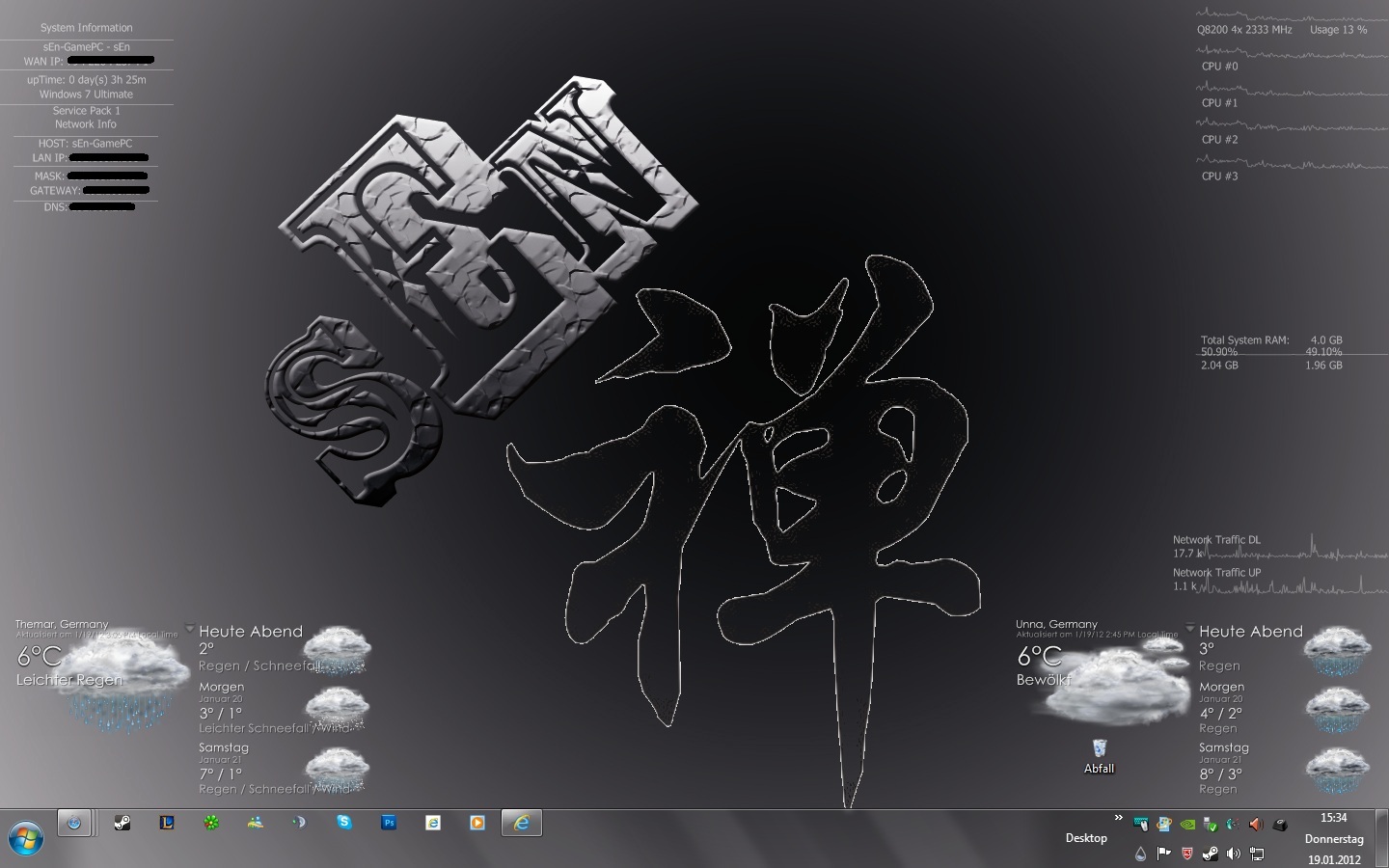 Hier auch mal mein Desktop. Dual Monitor Setup, der Primärmonitor ist ein Samsung SyncMaster 2233 mit einer Auflösung von 1680 x 1050 und der Sekundäre ein alter Fujitsu Siemens 19'' Monitor mit 1366 x 168, auf dem mithilfe von Rainmeter und diesem Skin dinge wie Systemauslastung usw. angezeigt werden, außerdem habe ich dort ein Widget um meine zwei TS Server zu stalken