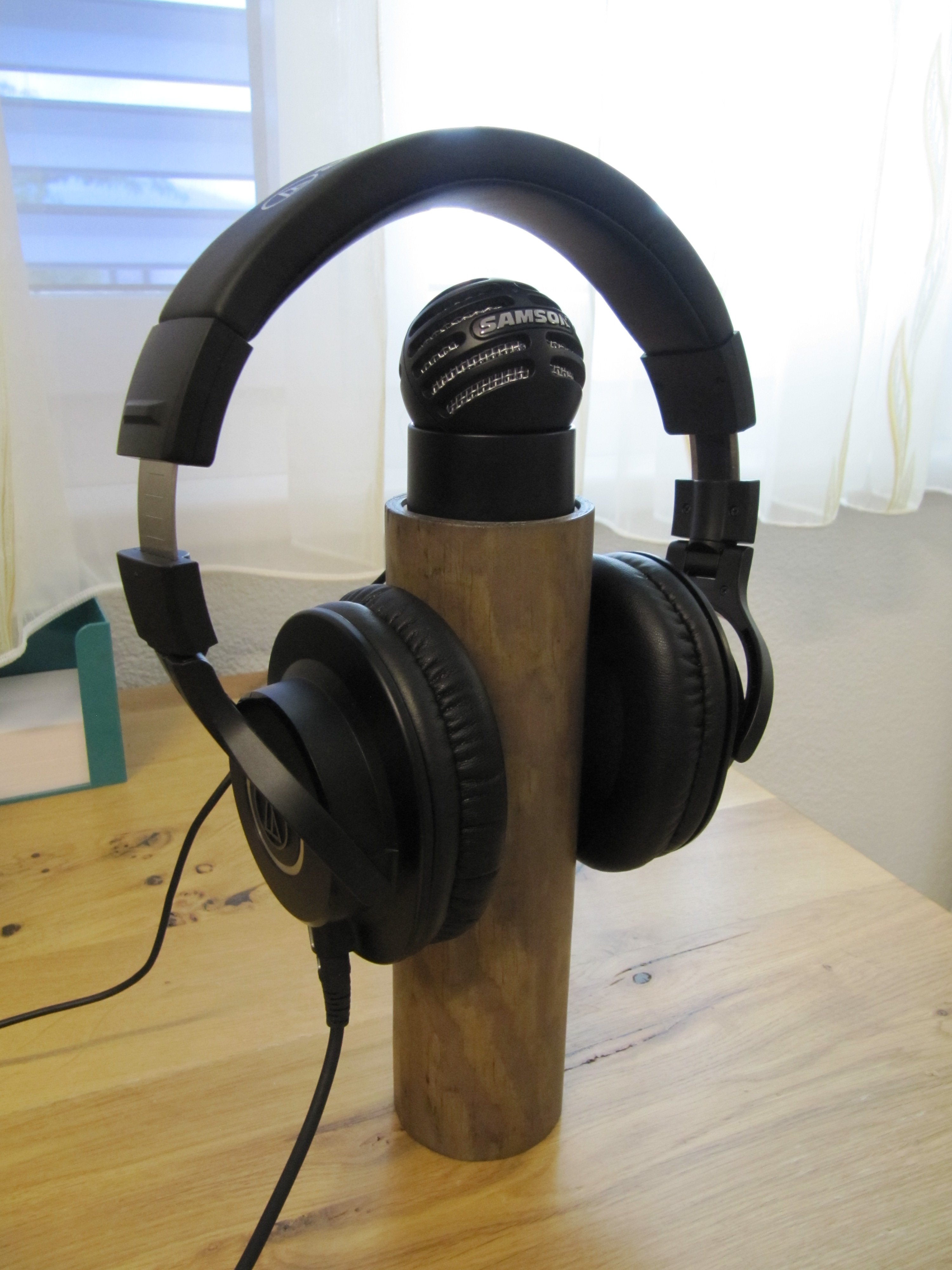 Das ist ein Stück Holz das man so rund abgedreht im Bauhaus kaufen kann. Beim Schreiner hab ich oben eine kleine Vertiefung drehen lassen, damit der Mic etwas im Holz sitzt. Dann noch lasiert und ein Klarlack drüber.