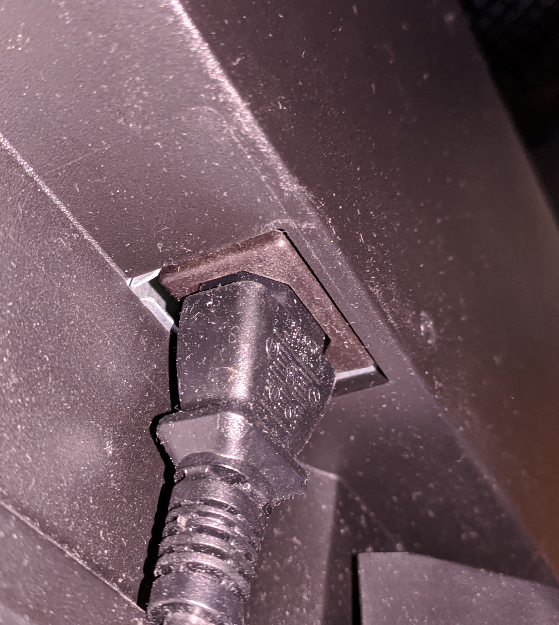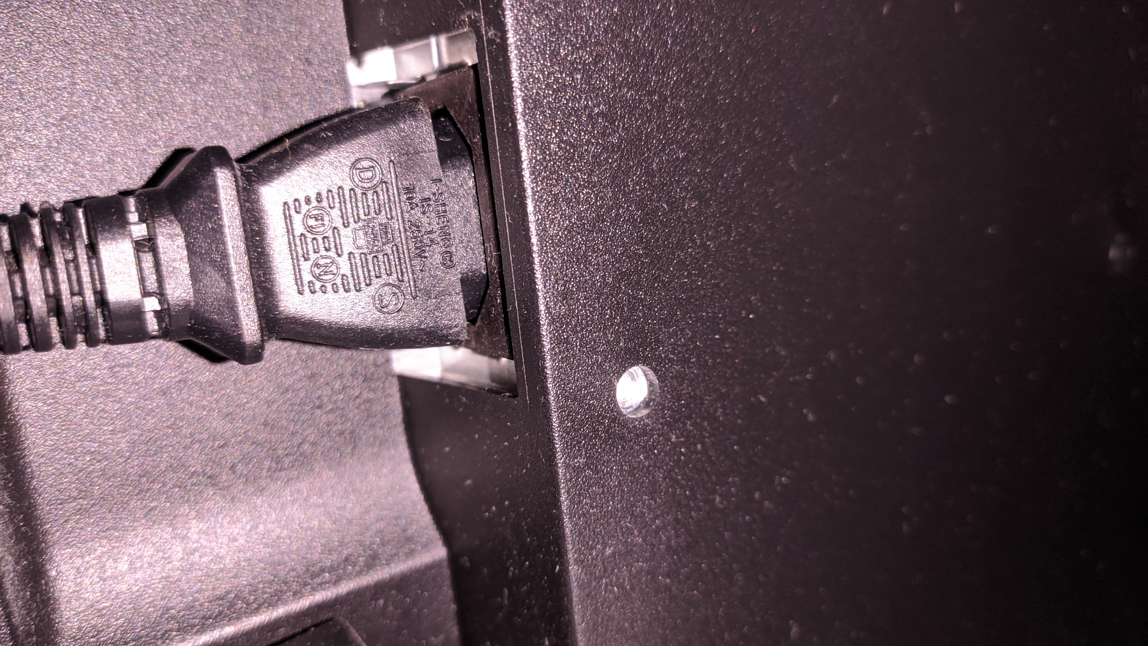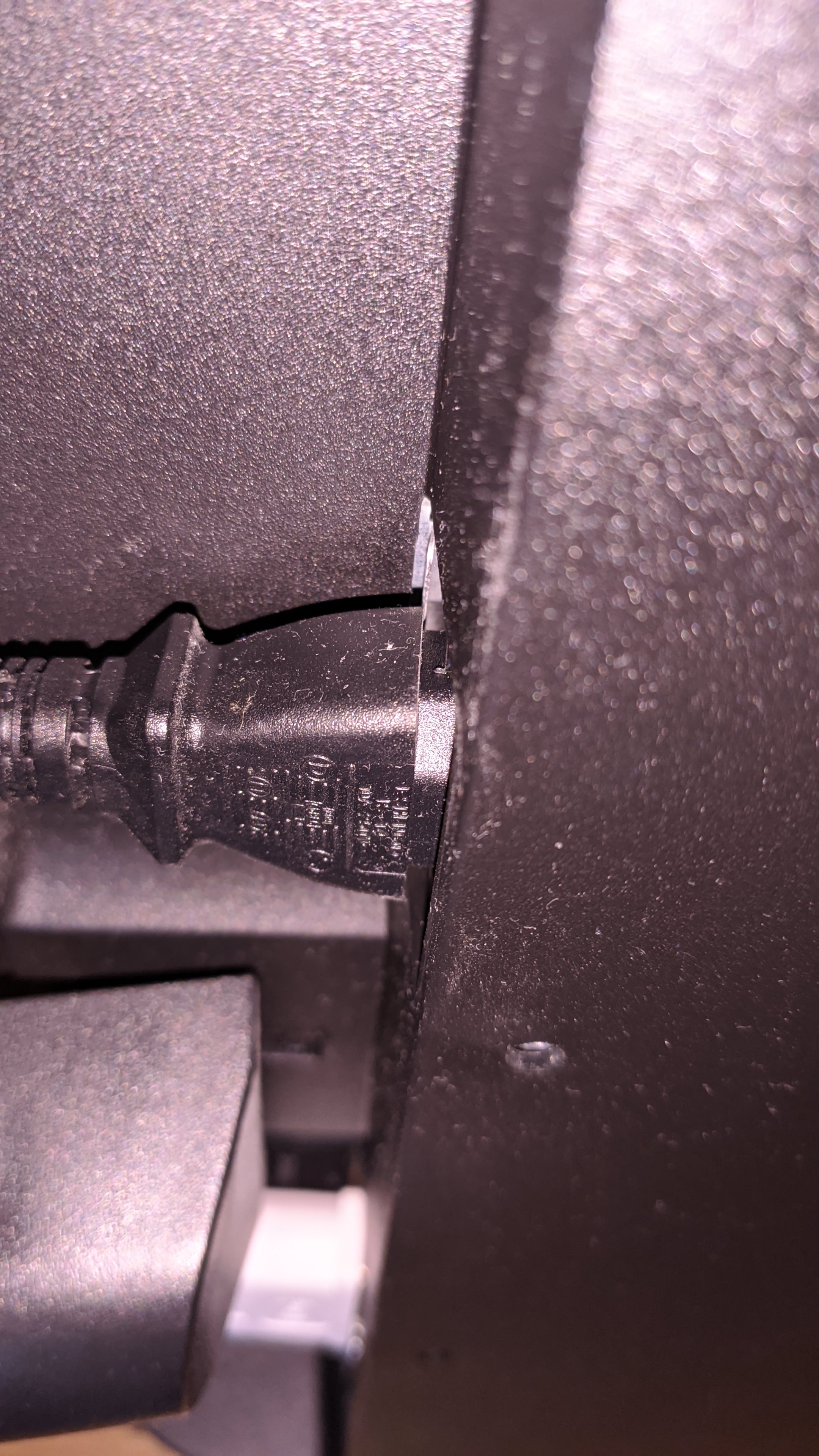 Beim wieder einstecken und prüfen des Sitzes stellt man fest dass die Buchse wo der Stecker vom Kaltgerätekabel Spiel hat. Nicht rechts links sondern rein raus kann man mit eingesteckteh Stecker diese um Gehäuse ein bisschen rein raus juckeln.
