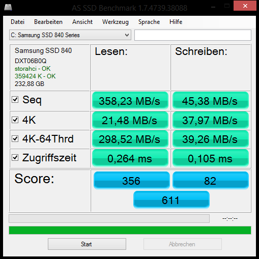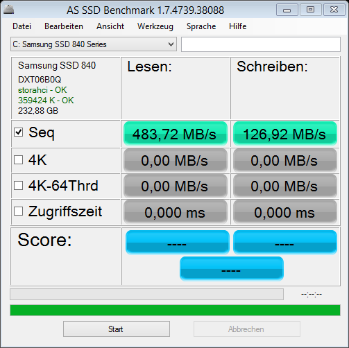 ich habe gestern aus Spaß mal AS SSD Benchmark laufen lassen und musste feststellen, dass meine Schreibwerte unterirdisch sind. Danach bin ich auf Fehlersuche gegangen:
