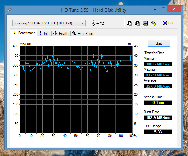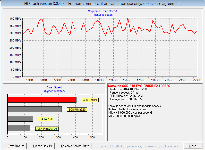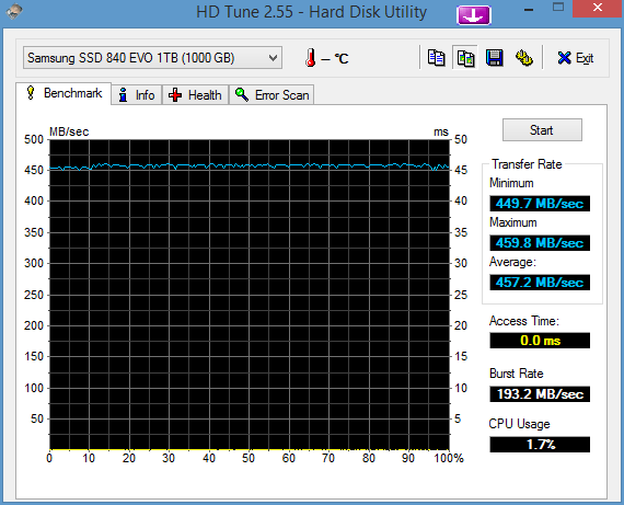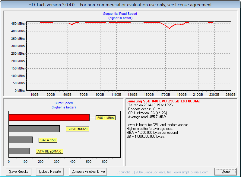 Ich habe eine interessante Entdeckung gemacht bei meiner Evo, und zwar ist es so das wenn ich mit HD Tune ein Benchmark starte ohne Antivirus + ohne aktive Anwendungen mit 0% CPU Last, dann erreicht die SSD als avg. Readwert nur ca. 325MB: