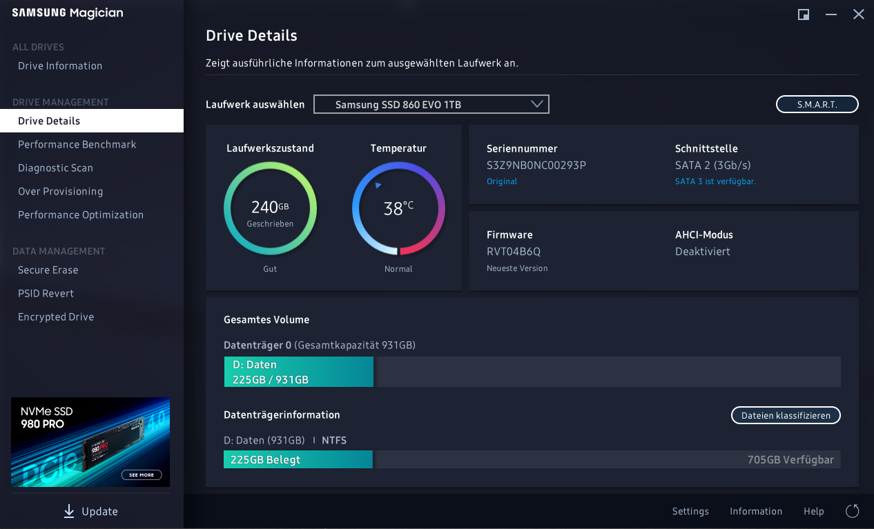 Hallo, ich habe eine Samsung 860 Evo, die allerdings nur mit SATA 2 Geschwindigkeiten läuft. Außerdem wird angezeigt, dass AHCI deaktiviert ist, obwohl das im Bios an ist. Das Mainboard ist ein Asus B550-E Gaming mit einem Ryzen 7 5800X. Andere SATA Ports habe ich schon ausprobiert.