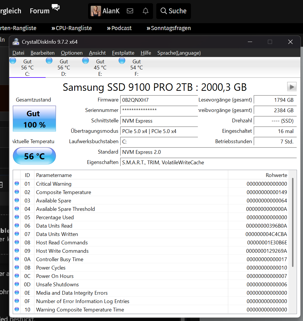 Was noch auffällt, die Samsung SSD haben zwei lesbare Temperatursensorgen in CrystalDiskInfo. (Mouseover über Temperatur) der zweite Sensor ist immer viel wärmer als der erste.