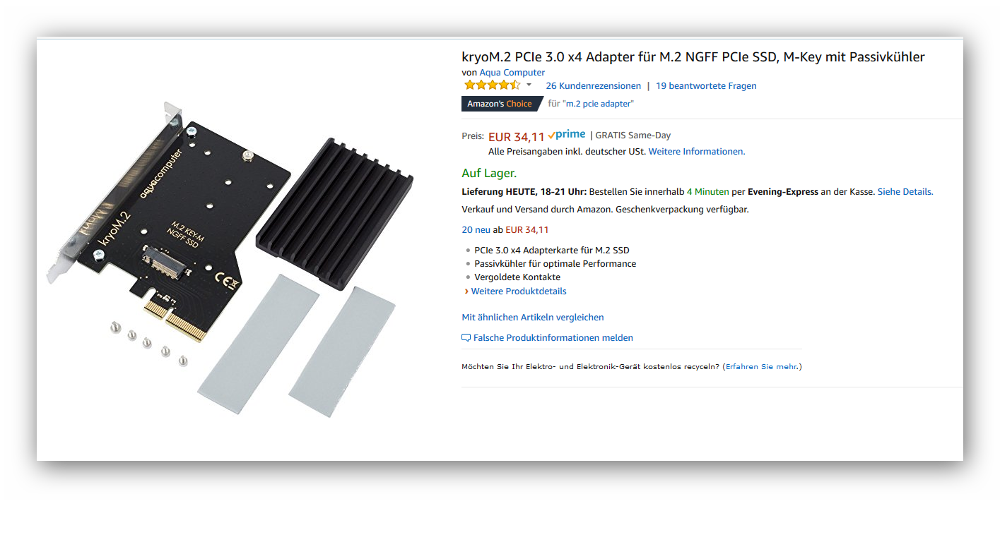 ich habe vor mein System mit mehr Speicher aund Geschwindigkeit aufzurüsten. Dazu habe ich mir eine 950PRO zu einem unschlagbaren Preis gekauft (Billiger als eine normale SSD mit 512 GB). Dazu einen M.2 PCIe x4 Adapter. (Bild im Anhang)