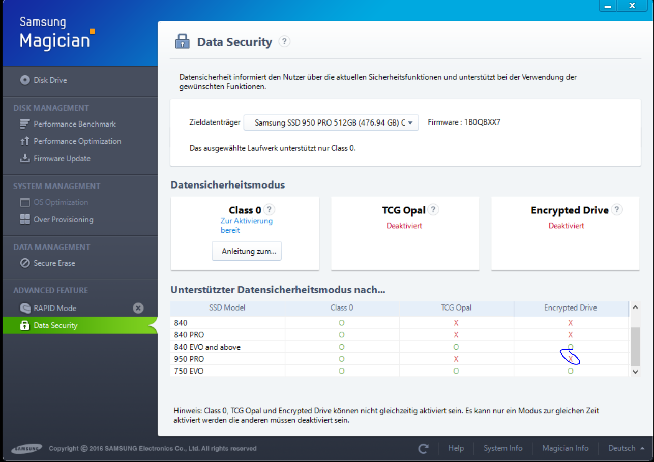 im magician tool wird angezeigt das die 950 SSD keine verschlüsselung zulässt?
