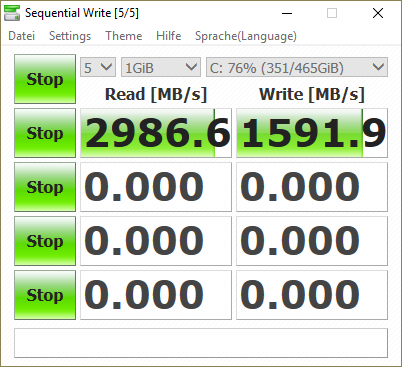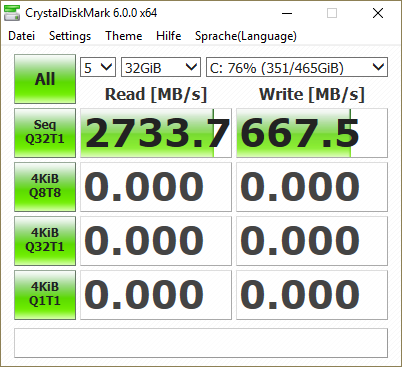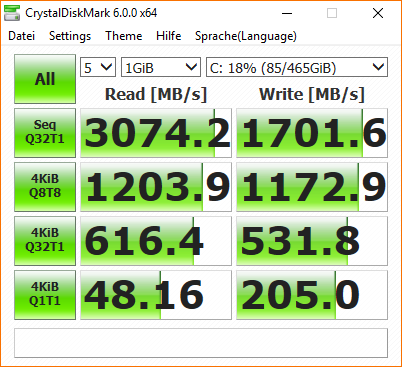 Die Testgröße zu verändern inkl. dem gesonderten NVMe Treiber verschiebt bei AS SSD die werte minimal nach oben, aber weit von der Werksangabe. Was fast direkt zu 3500 MB/s read führt ist ein Bench mit Crystal Disk - wobei damit auch die anderen SSDs massiv an Perofmance gewinnen. Beende gerade den Run, aber die alte Samsung 830 kommt auf 546 MB/s read, was mehr als ihre Werksangabe ist :D Die Testmethodik ist daher nochmal zu prüfen.