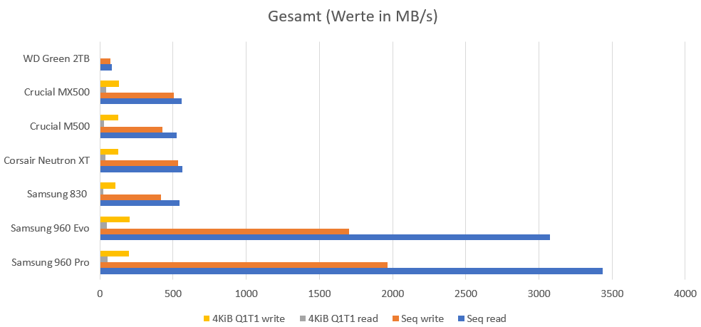 Mein Gesamtbestand an SSDs umfasst derzeit die Samsung 960 Evo 500GB, Corsair Neutron XT 240GB, Samsung 830 256GB, Crucial M500 480GB & Crucial MX500 1TB. Crystal Disk Mark 6.0 fördert folgendes Bild zu Tage:
