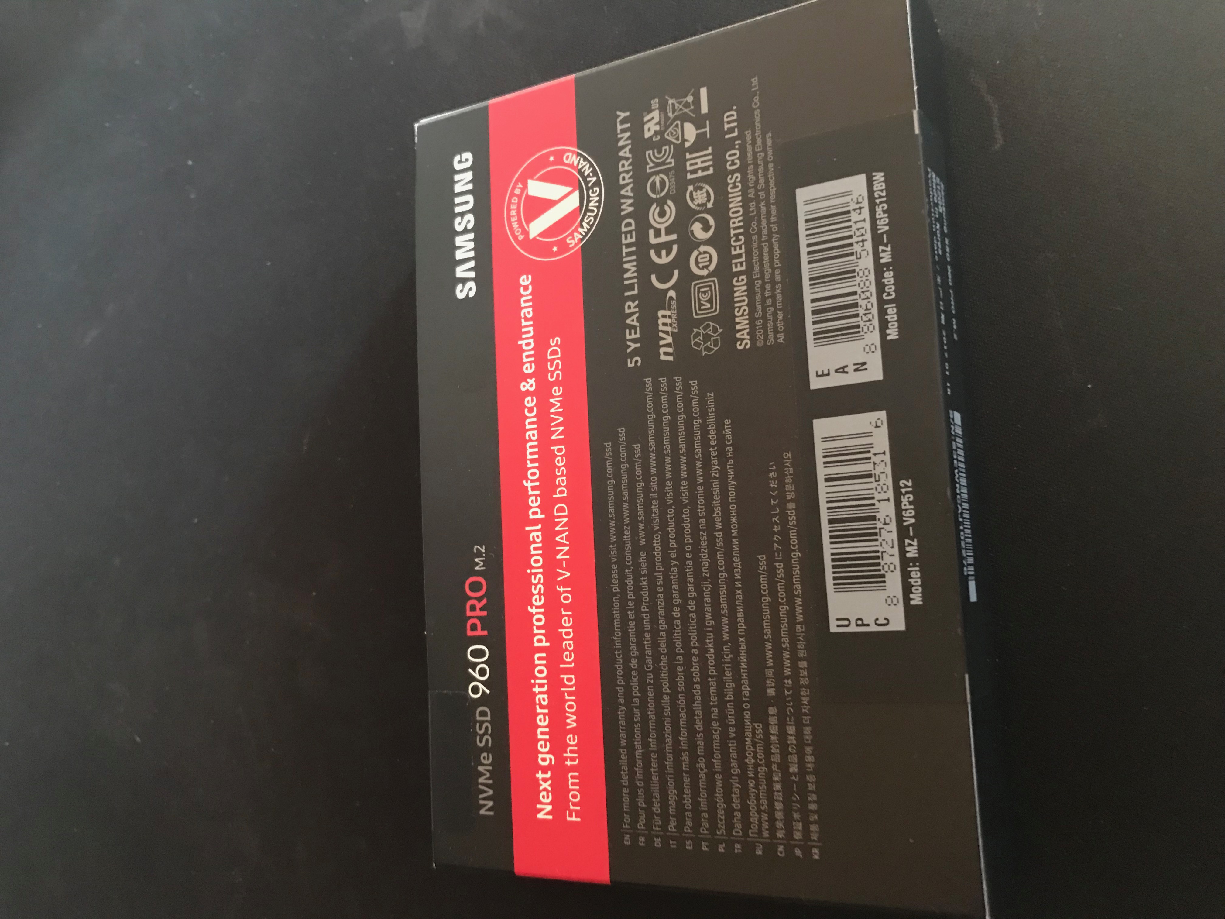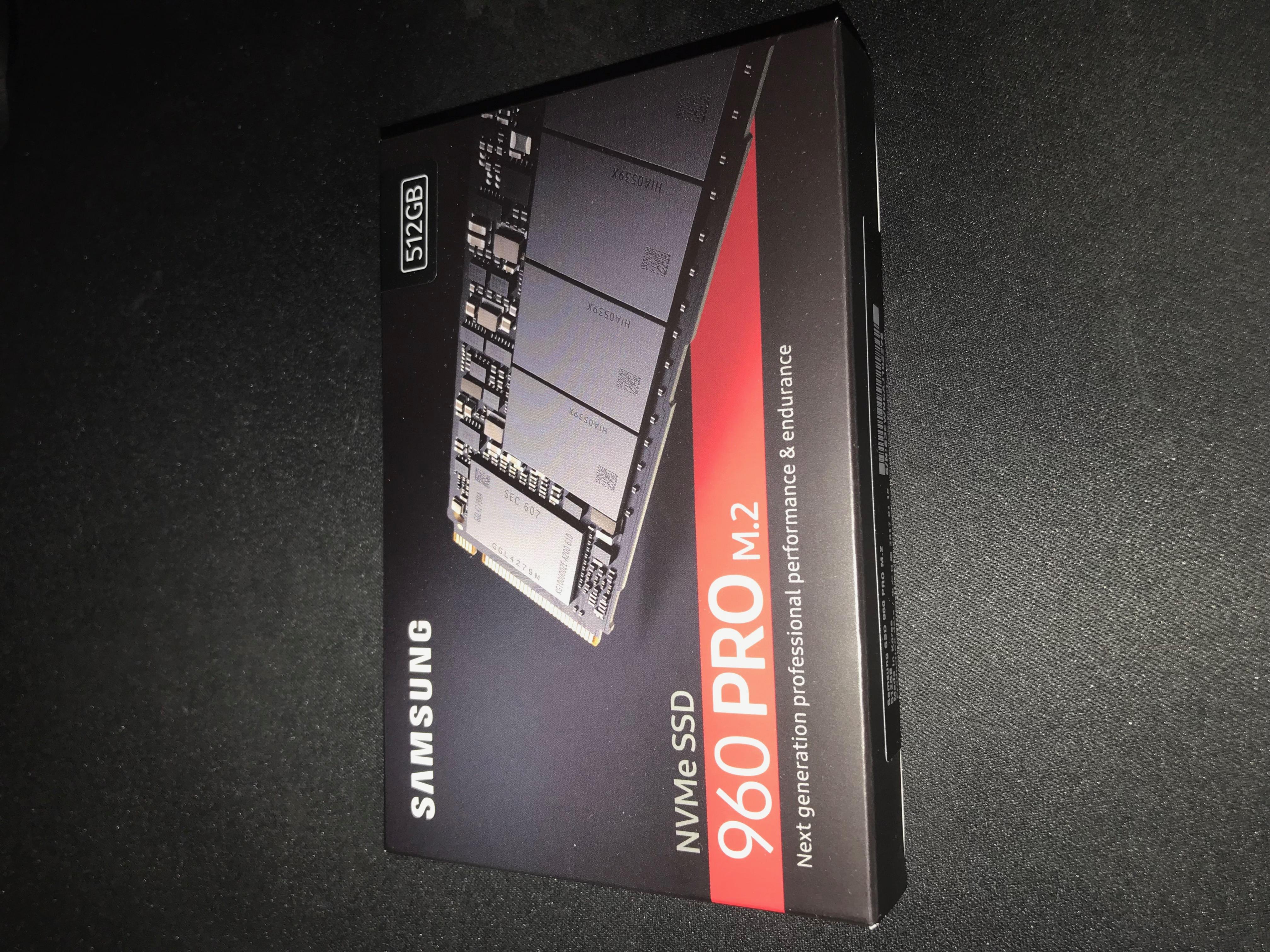 Als Nachrücker hat sich für mich überraschend die Gelegenheit geboten eine Samsung 960 Pro 512GB näher im Detail betrachten. Bis ich das sehnlich erwartete Paket in den Händen halten konnte vergingen noch einige Paket und logistische Schwierigkeiten. Schlussendlich kam ein schlichtes und leichtes Paket bei mir an, welches doch starke Ähnlichkeiten zu meiner Samsung 960 Evo 500GB aufwies. Das ist eine Untertreibung, da die Verpackung und auch die SSDs optisch kaum voneinander zu unterscheiden sind. Leider hat sich trotz meiner mehr oder weniger ausgeprägten Schachtelordnung eine Suche nach der Evo Verpackung als erfolglos erwiesen.