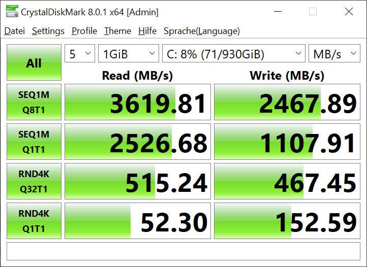 Auch wenn die maximalen Transferraten gerade bei einer Systemlaufwerk nicht ganz so relevant sind, sind die von @mgutt erzielten Ergebnisse für eine Samsung SSD 970 EVO mit 1 TB, die mit PCIe 3.0 x4 angebunden ist zu niedrig. Das zeigen nicht zuletzt die Werte von @dermoritz.
