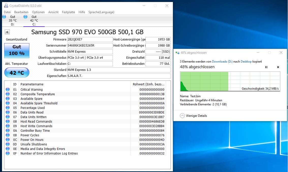 Habe mal beide Platten abgeklemmt und versuche mal diverse Tests, was mir aber direkt aufgefallen ist, ist das der PC start hat nur noch 25 sec gedauert hat und mit den anderen 2 Platten dran dauert der Start 45 Sec.