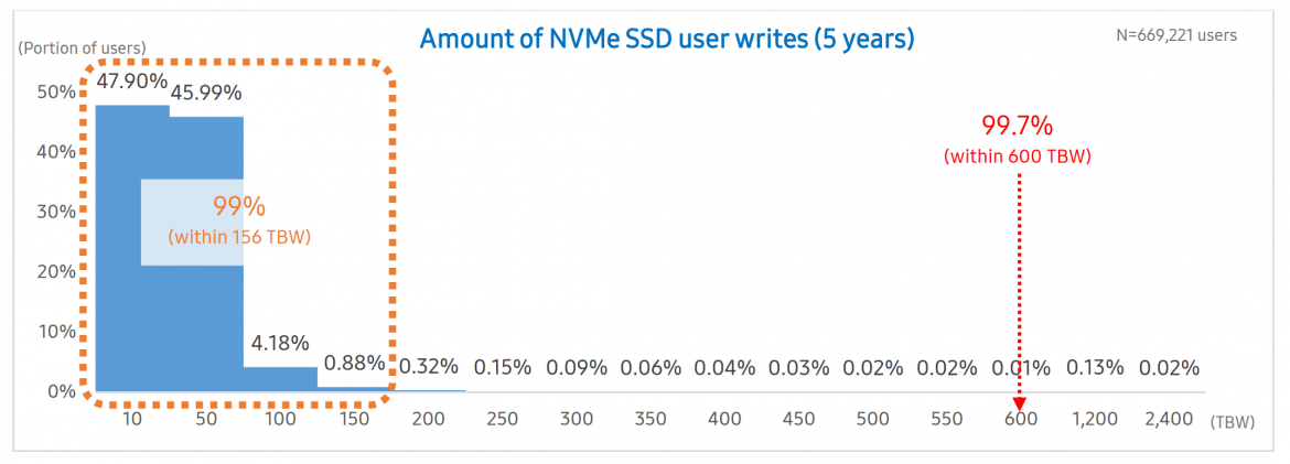 Dies reicht doch, bisher hat sich schon gezeigt, dass nur die wenigsten User mehr als 10TB pro Jahr auf eine SSD schreiben. Samsung hat folgende Grafik dazu veröffentlicht:Faust2011 schrieb:Allein die Sache mit dem Wechsel auf TLC und damit auch die Halbierung der TBW. Oha.