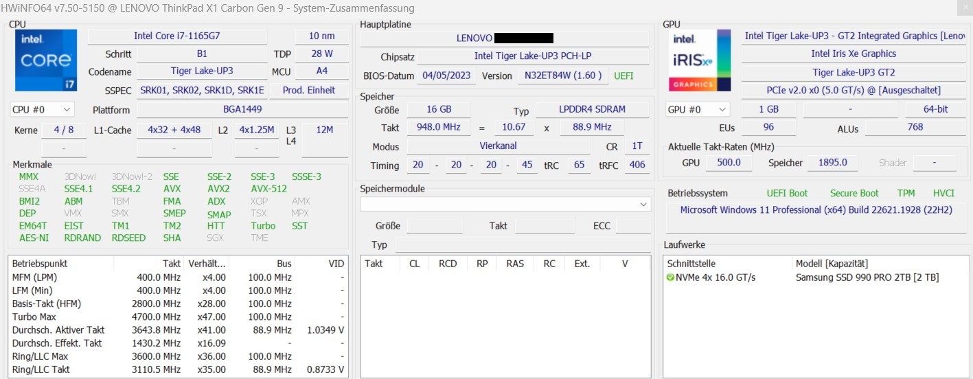 Ich habe einen Lenovo X1 Carbon Gen 9 mit i7 und 16GB RAM.