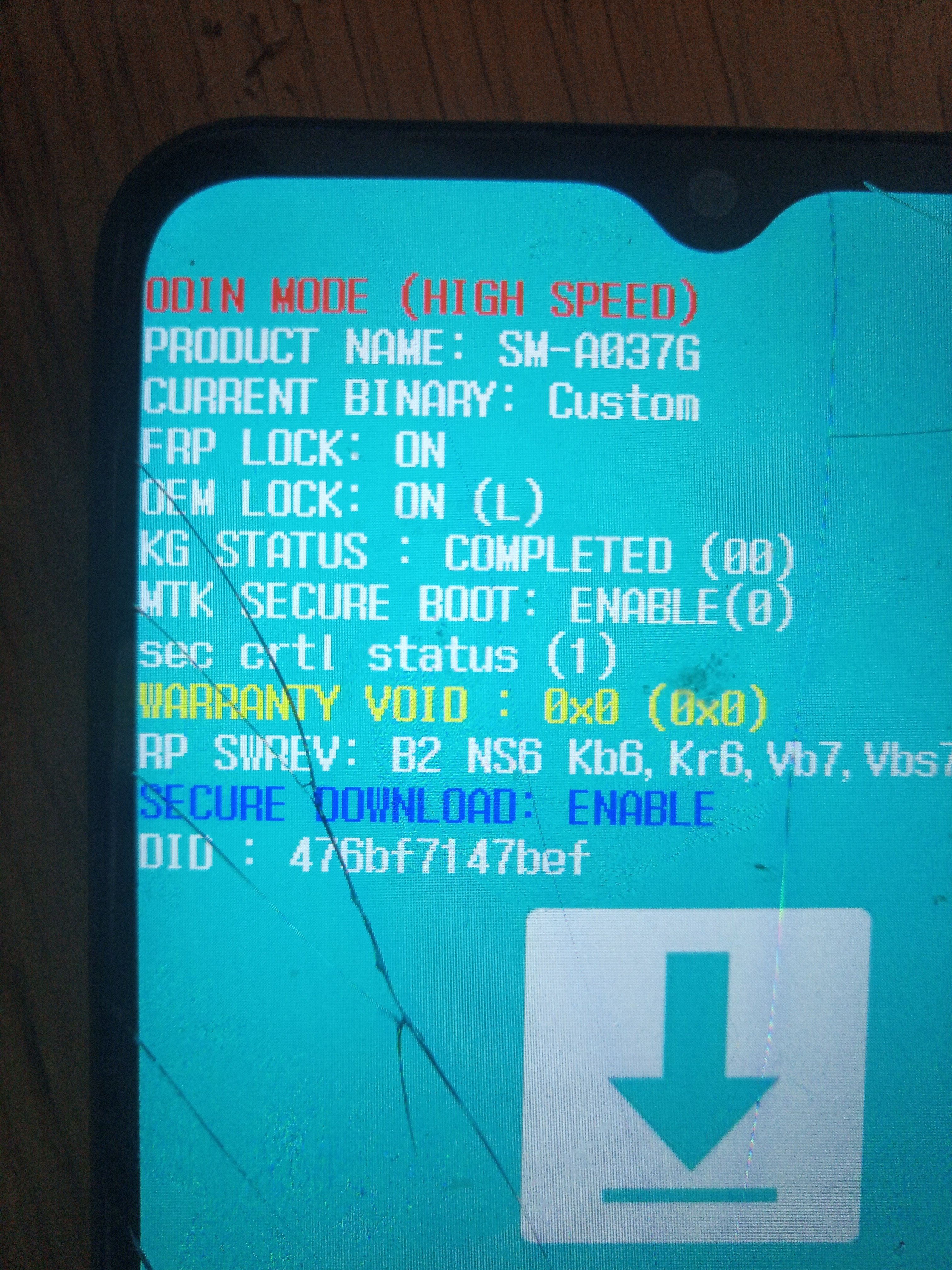 Wenn ich das Telefon ausschalte und mit Power Taste + Vol.up starte kommt erst das Samsung Logo dann eine Anzeige einer ahnlichen Warnung danach ein Ladebildschirm wo bei 25% das Gerät neustartet.
