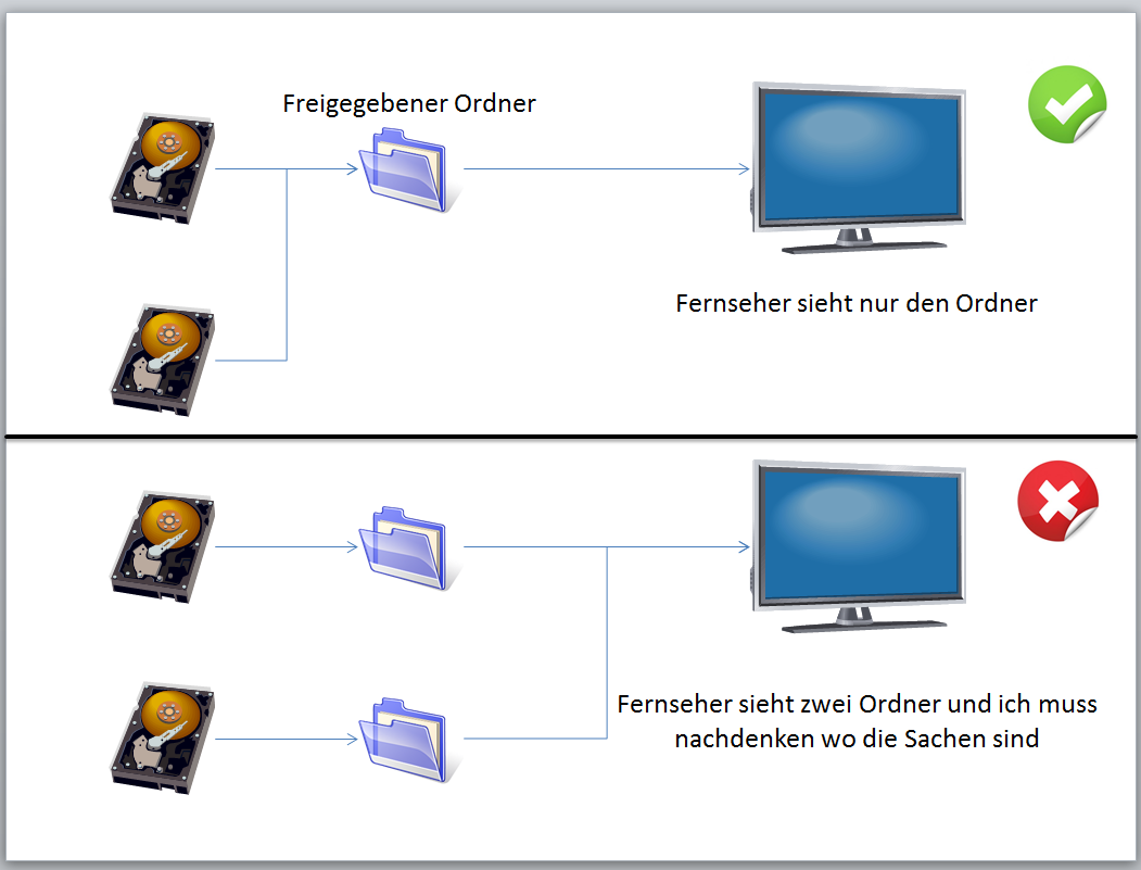 Du gibst Festplatte1 und Festplatte 2 frei, auf beiden befindet sich ein Ordner HDTV, dann sieht meine Glotze nur den Ordner HDTV aber mit den Inhalten aus beiden Festplatten.