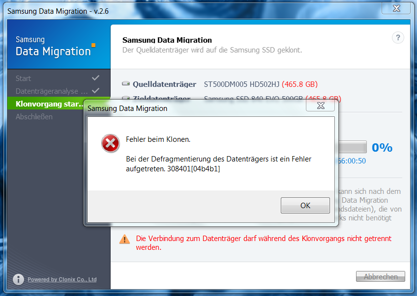 Jedoch habe ich mit dem migrationsprogramm so meine schwierigkeiten, und zwar das bei 0 % und 333mb dieser fehler auftritt.