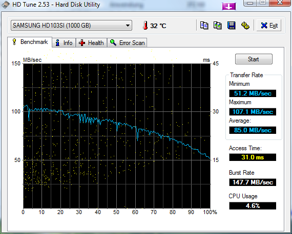 Habe mir vor einigen Tagen auch eine HD103SI als Backup-Platte geholt und sie bisher testweise auf der durchsichtigen Plastikverpackung neben dem Rechner liegen gehabt. HDTune hat als Zugriffszeiten katastrophale 30-35ms angegeben.
