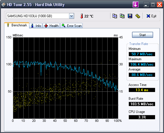 Die Temperatur der Platte ist während des Test sehr gering. Im Vergleich zur WD-Platte ist das Samsung Modell mit 36° C ganze 10° C kühler, was natürlich auf die geringere Drehzahl zurückzuführen ist.