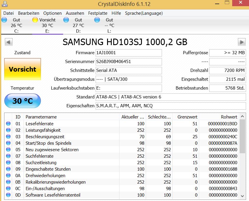 Ich habe uplay gestartet und es passierte nichts. Es hat sich so ereignet, dass die HDD dabei 2 min geackert hat, ohne dass mir ein Fehler angezeigt wurde. Also habe ich die Festplatte mit Seatools einem Langzeittest unterzogen. Dieser Test wurde nach 5 min als fehlerhaft abgebrochen. Crystaldiskinfo (s. Anhang) gibt eine gelbe Warnung aus. Ich kann jedoch mit der Tabelle nichts anfangen.