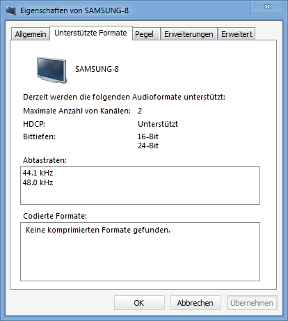 Dann stellt er leider auf meine (direkt am PC angeschlossenen) Kopfhörer um. Ich kann nur die Option "HDMI verwenden" anwählen, wenn sonst keine anderen Lautsprecher am PC angeschlossen sind. Beim Ausgabemodus ist dann auch nur "PCM von PowerDVD dekodiert" möglich und unter Erweitert findet sich auch keine passende Einstellung :/