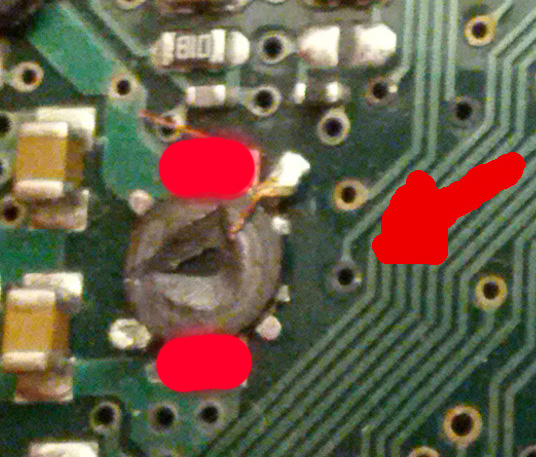 Anbei ein Foto von dem Unglück, ich habe mit Pfeilen einmal die Spule und einmal die Stelle an der sie abgebrochen ist markiert.