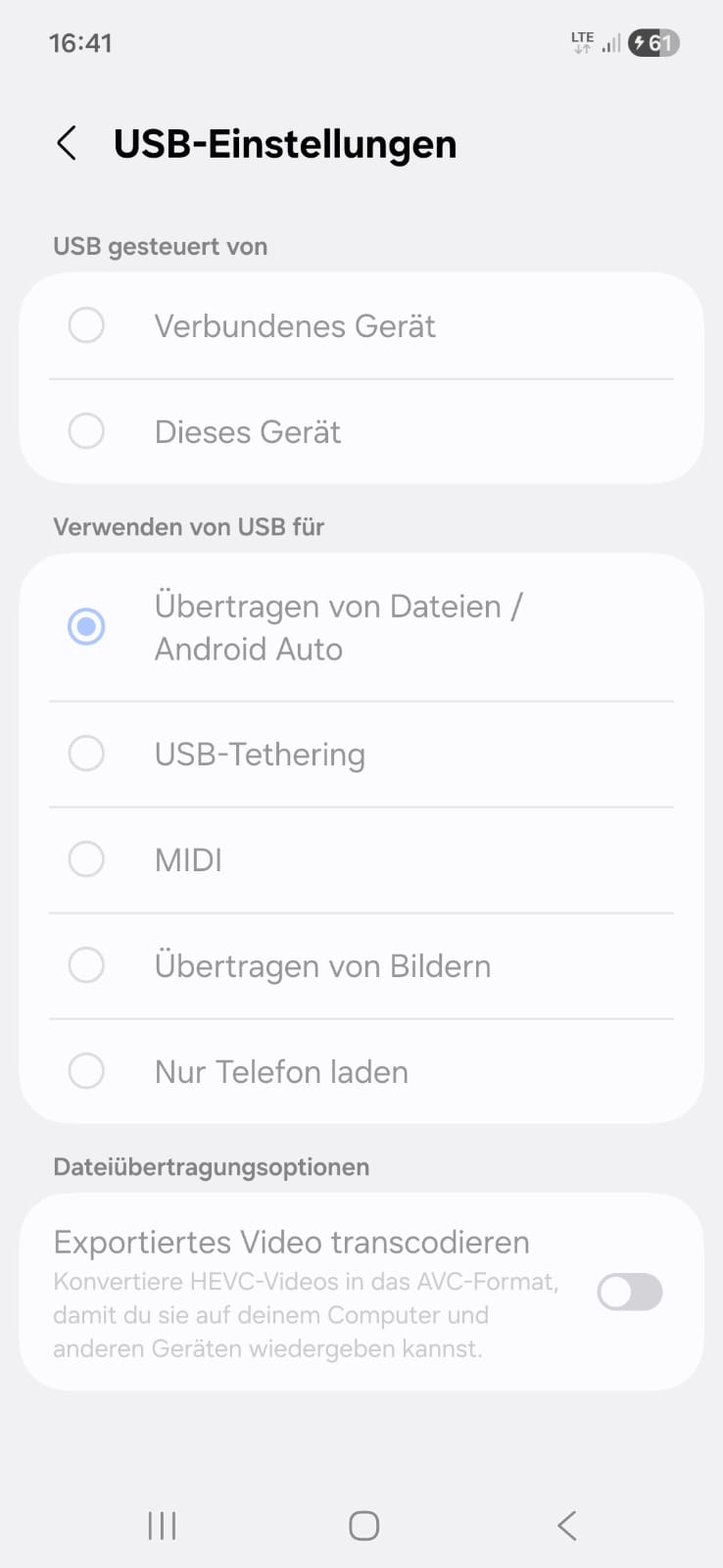 - In den Entwickleroption außerdem eingeschaltet in den USB Einstellungen "Übertragen von Datein / Android Auto"