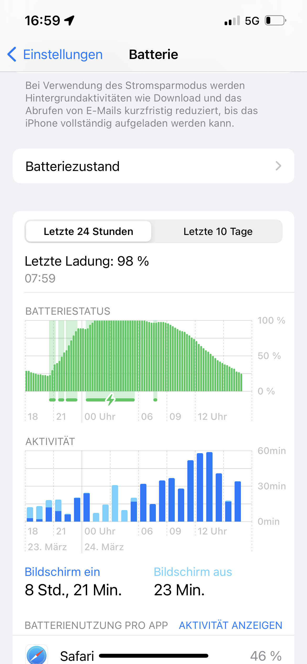 Hier von heute. Die paar Minuten Zwischenladen wischen 07:00 und 08:00 Uhr war auf Grund der Nutzung von CarPlay, auf dem Weg ins Büro. 22 Minuten bei 5W Laden.