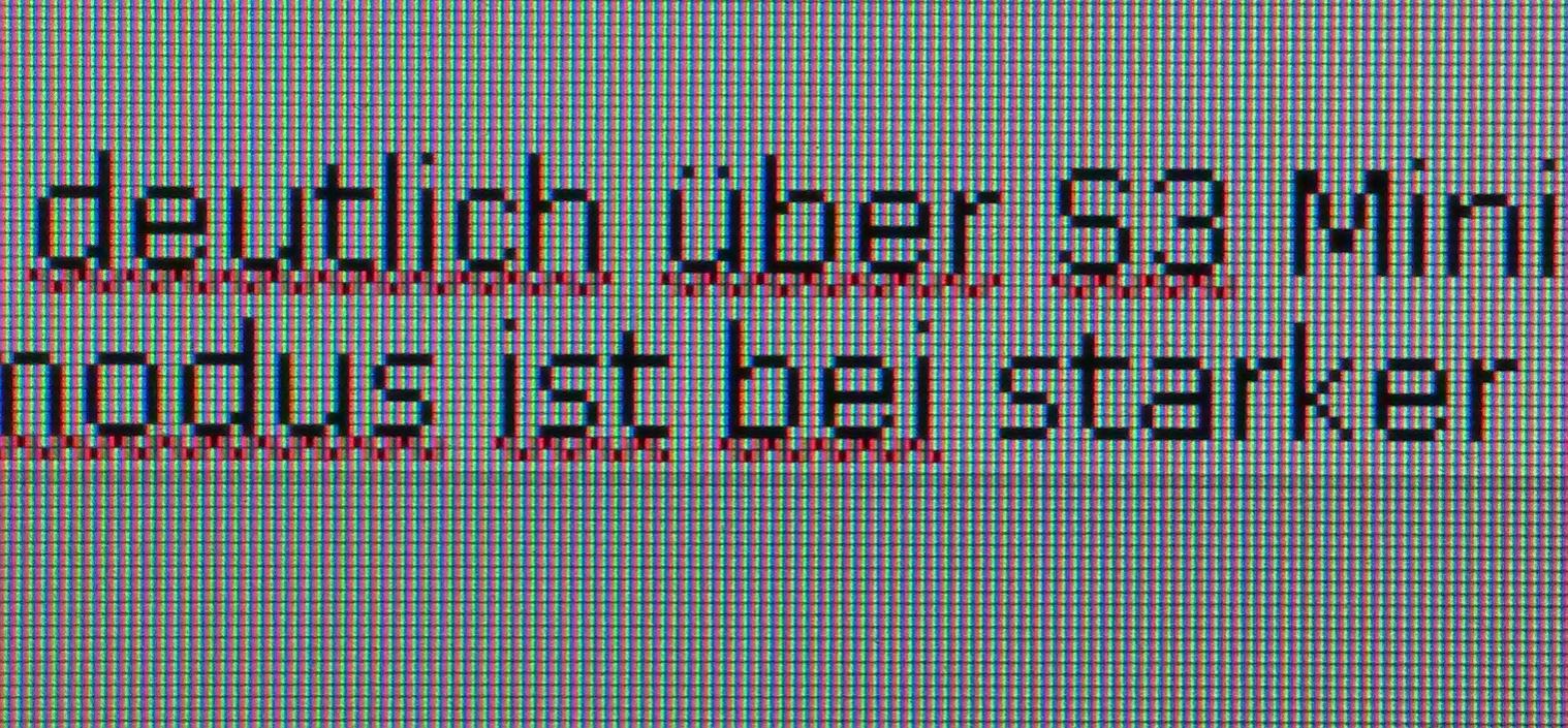 Der Makromodus ist bei starker Ausleuchtung hervorragend - ich denke der Anhang spricht für sich, trotz CB-Komprimierung. Fotografiert wurde mein Eizo 23'' FHD Bildschirm.