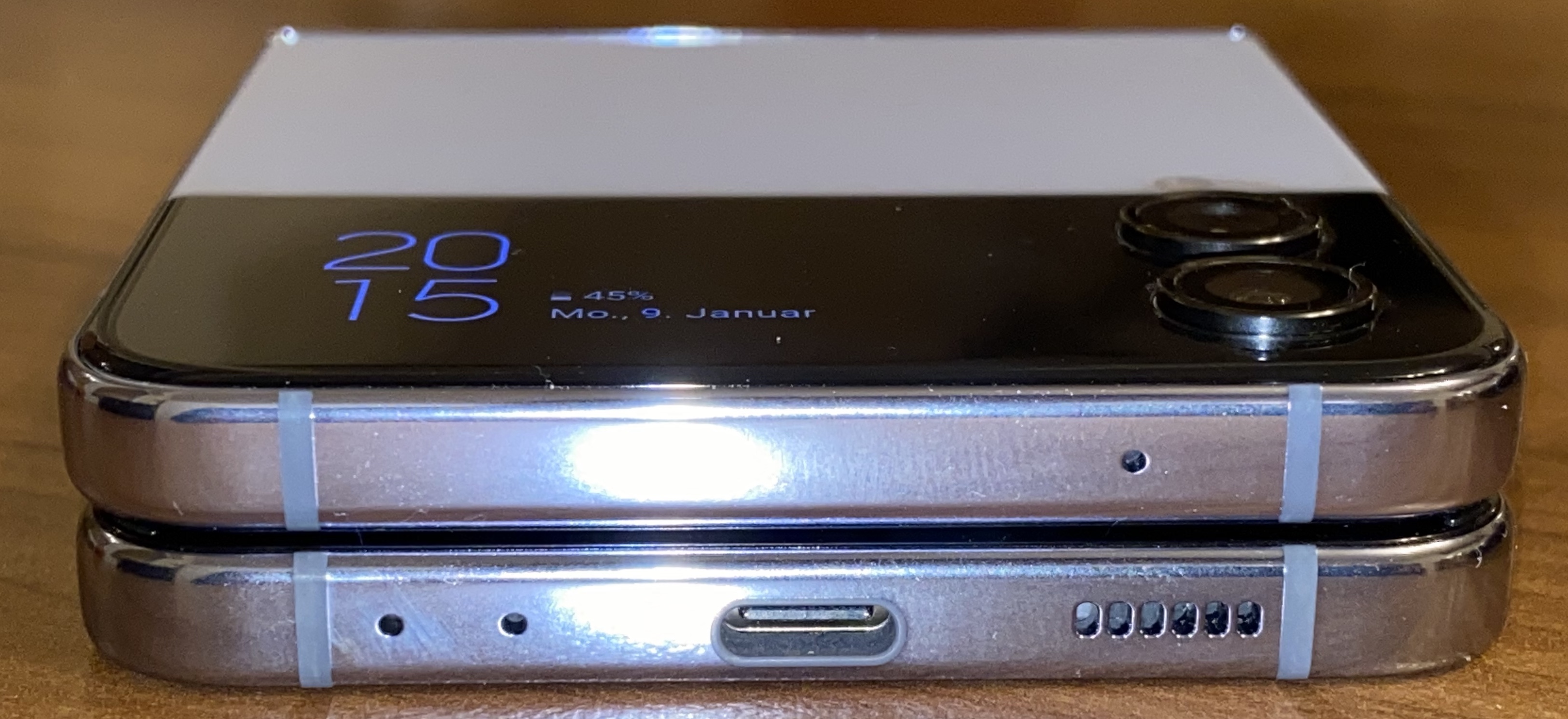 Auch sitzen die Displays im zusammengeklappten Zustand nicht 100%ig direkt übereinander. Das linke ist ganz minimal weiter links (sieht man an den Antennenstrichen, die nicht 100%ig übereinander liegen).