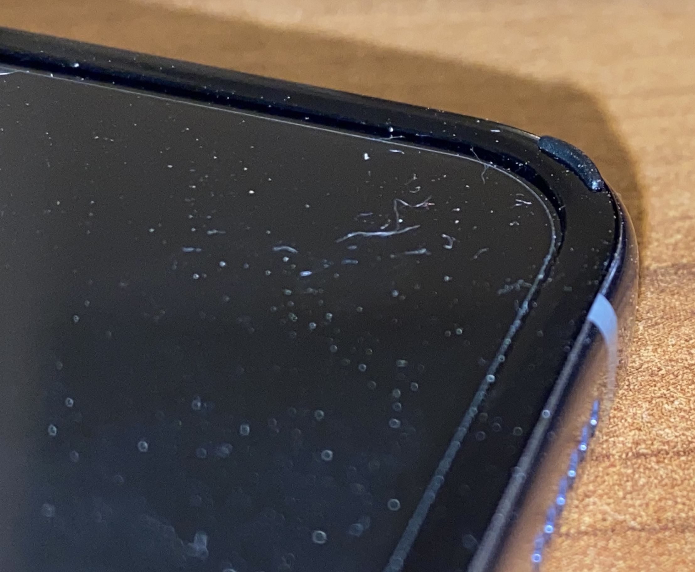 Ist das Gerät aufgeklappt, spürt man unten links und rechts so kleine "Erhebungen", die beim zugeklappten Display dafür sorgen sollen, dass die Displays nicht aneinander kommen. Dieser Abstandshalter (so nenne ich ihn mal) ist rechts einiges höher als links und man sieht auch, dass das Display leicht schräg zusammengeklappt ist.
