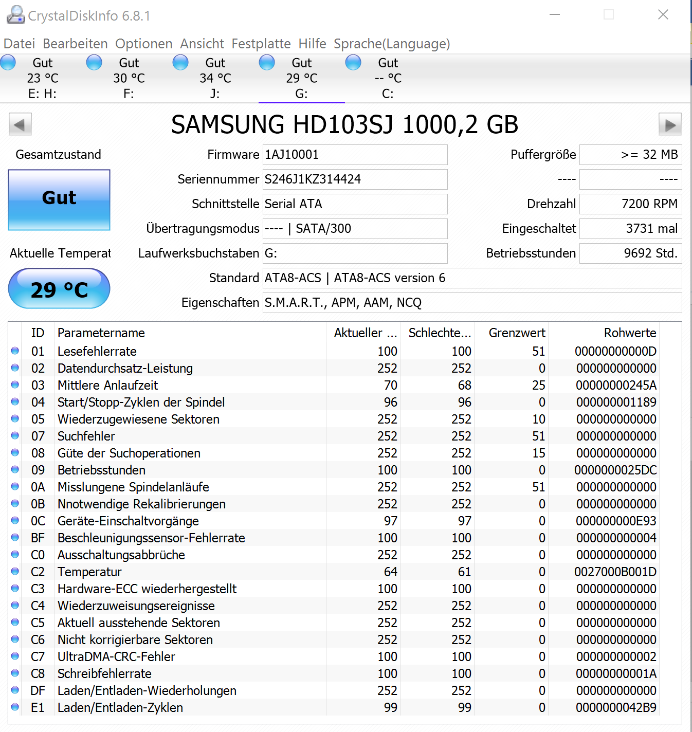 Um den möglichen Ausfall der Platte und den dahergehenden Datenverlust muss ich mir keine Sorgen machen, da ich bereits alles Wichtige auf einer externen 2 TB Platte sowie 3 TB internen nochmals abgesichert habe.