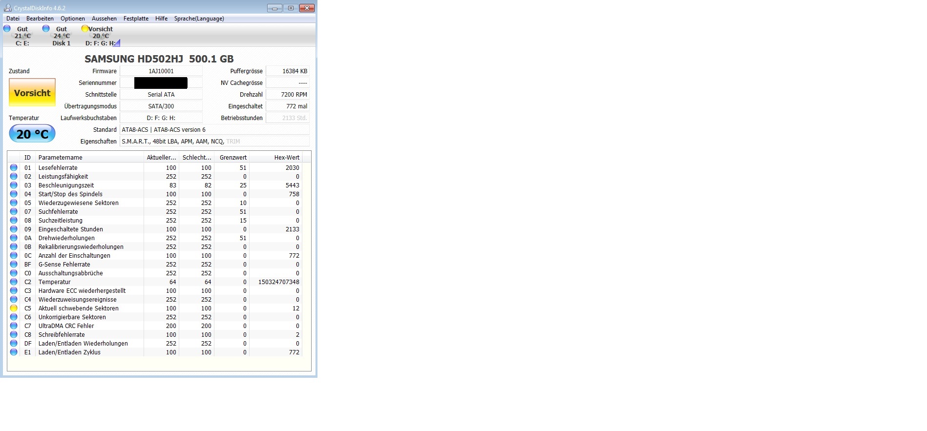 Meine Samsung HD502HJ mit 500GB (reine Programme-, Spiele- und Datenplatte) hat gestern Abend 12 schwebende Sektoren gemeldet (besser gesagt CrystalDiskInfo)…