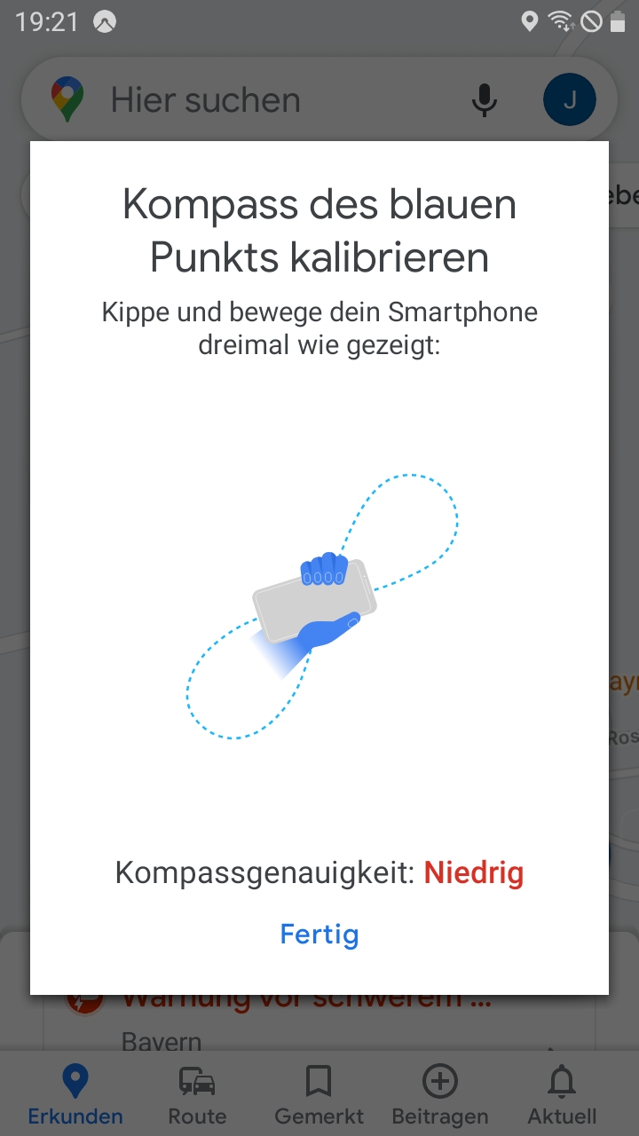 Ich habe mir das Gerät gebraucht gekauft, der Einsatzbereich sollen Biketouren sein mit kommot und Google Maps. Beide Apps funktionieren aber nicht richtig, die Blickrichtung wird nicht bzw. nicht korrekt angezeigt und die Genauigkeit lässt zu wünschen übrig, Kurven werden geschnitten, etc. Kommot gibt bei jedem Start eine Fehlermeldung aus (siehe Bild 1). In Maps bleibt die Kompassgenauigkeit auf niedrig egal wie oft ich mit dem Gerät eine 8 in die Luft male (siehe Bild 2).