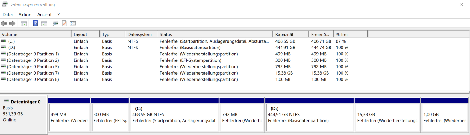 In der Datenträgerverwaltung sieht sieht es aus wie folgt (ich kann aber hier keine Partition löschen auch nicht über diskpart).