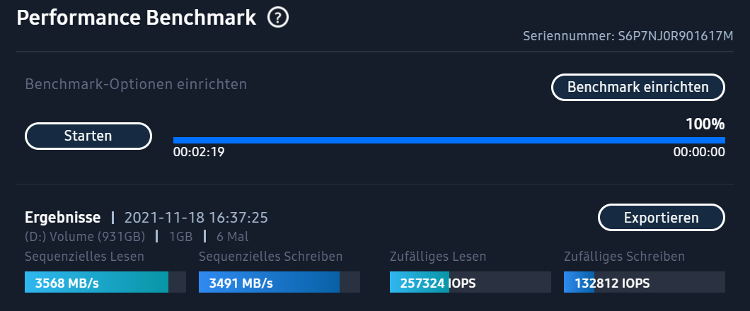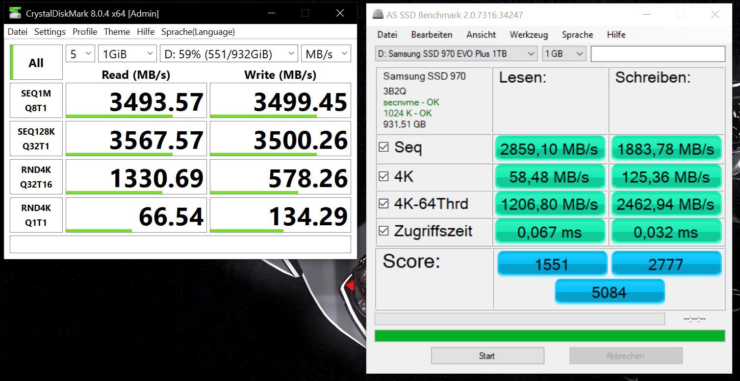 ich habe mir vor kurzem ein PC gebaut. Die Hardware läuft ziemlich gut bis auf die Samsung NVMe 970 EVO plus. ich habe sie mit "Samsung Magician" getestet, wie auch mit "User Benchmark" wobei die Werte, bei beiden Benchmarks, weit unter der eigentlich möglichen Leistung liegt. Die Schreib- und Lesegeschwindigkeit liegt gerade mal bei 400Mb/s bzw. 300 Mb/s. Dabei sollte sie bei beiden Geschwindigkeiten um die 3000Mb/s schaffen.
