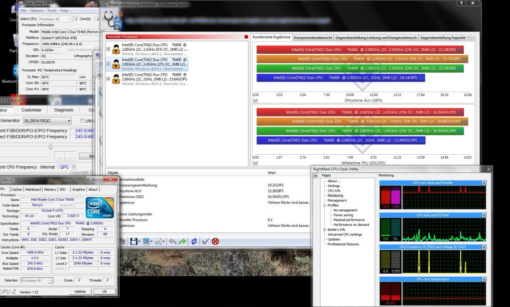 Außerdem die Temperatur beobachten! Falls ihr es übertreibt, verschwimmt die Anzeige und das Notebook friert ein. Um das Notebook auszuschalten muss die Herunterfahren Taste paar Sekunden lang gedrückt gehalten werden. So ein Hard Reset tut keinem System gut und kann zu Datenverlust führen - schlimmstenfalls sogar zu einer beschädigten Festplatte (RAW-Format). Gebt deshalb Obacht und speichert vor dem Übertakten alle Dokumente u.ä. ab!