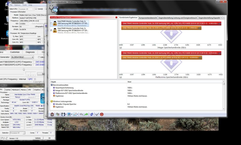 Der Standard FSB beim T6400 des R522 ist 200 MHZ, somit entspricht es einem Speichertakt von 400 MHZ - dieser muss ' * 2' multipliziert werden und wir haben unseren reellen Speichertakt - 2x400 = -800 MHZ.